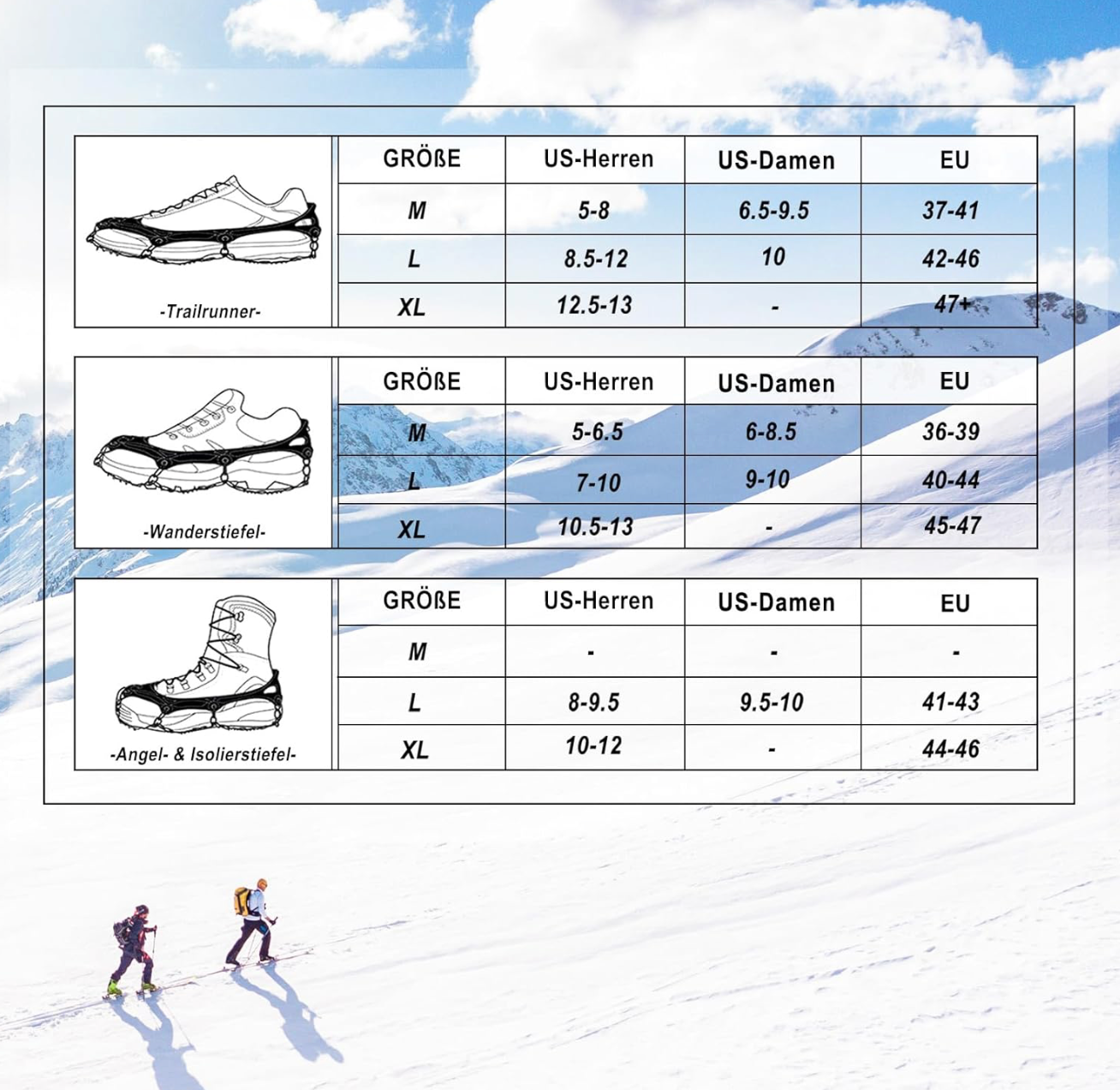 Unsere Grödel sind von hochwertigen Marken, wie LACD, Camp, Stubai und Cimkiz. Unsere Modelle decken alle gängigen Größen für verschiedene Schuharten (siehe Foto: Größentabelle) ab.
